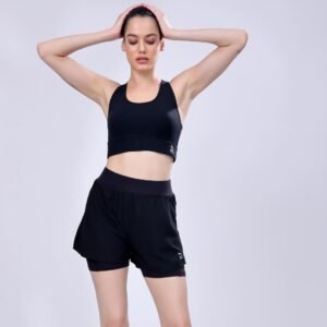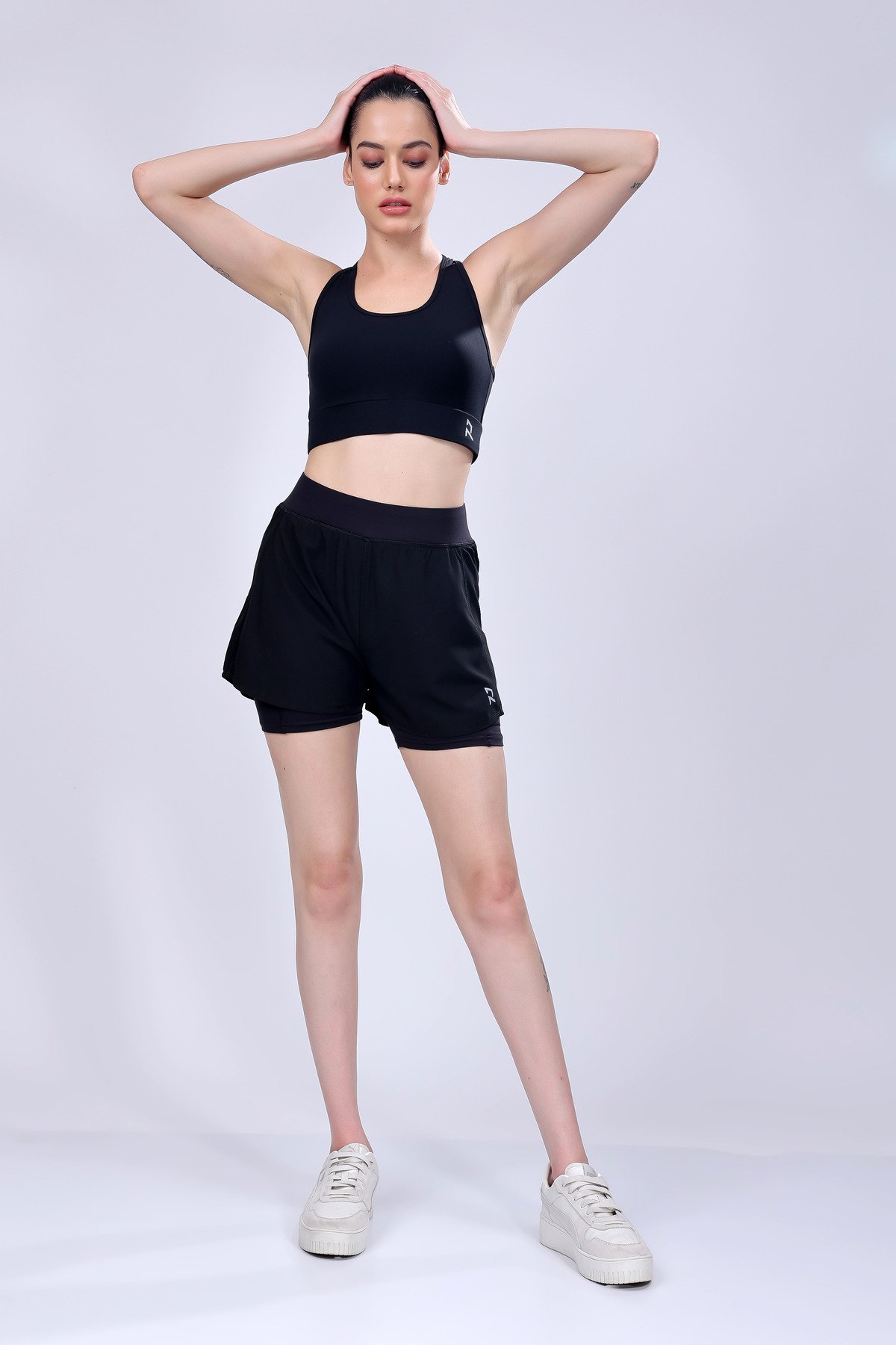 Nightingale In Pitch Black Shorts And Sports Bra